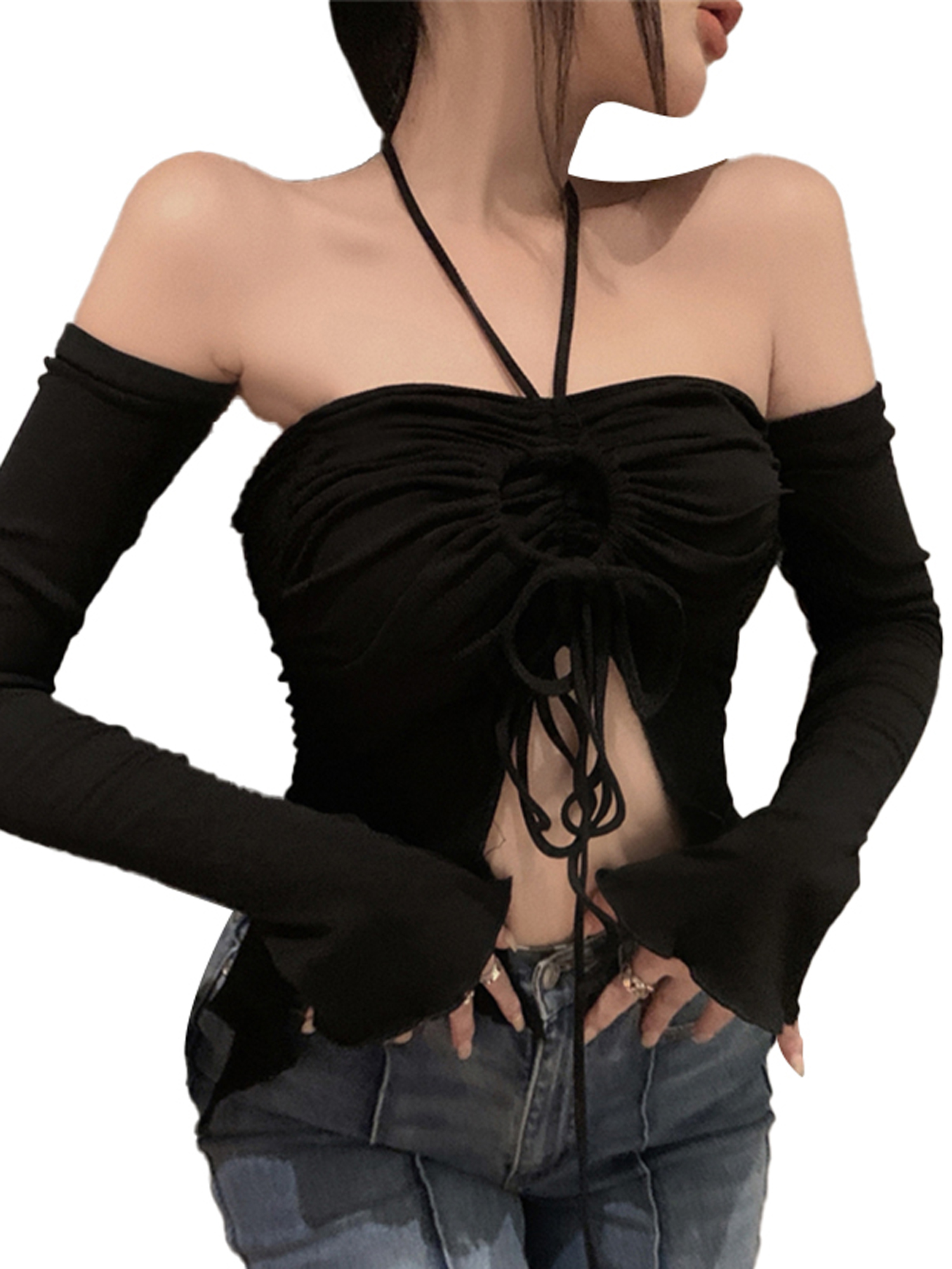 Women Halter Neck Crop Tops With Sleeves Pleated Tie Up Drawstring Summer Slim Fit Shirt Walmart Com